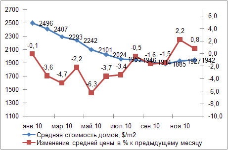 В декабре 2010 года средняя цена представленных к продаже частных домов в Киеве составила 1942 долл. США за 1 кв. м. По сравнению с январем, средняя цена 1 кв. м домов уменьшилась на 22,2%, а количество продаваемых домов увеличилось на 46,2%.