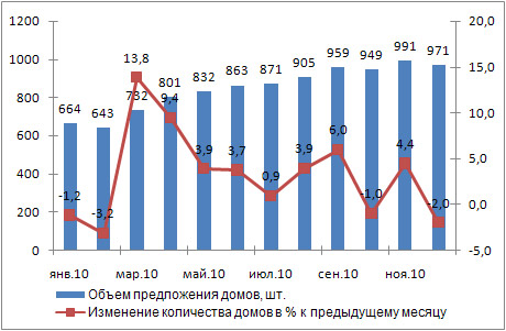 Количество представленных к продаже частных домов, в декабре относительно января 2010 года, увеличилось на 46,2% до 971 единиц. Объем предложения частных домов в общей площади и денежном выражении увеличился соответственно на 51,8% и 14,2%.