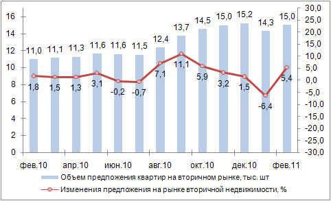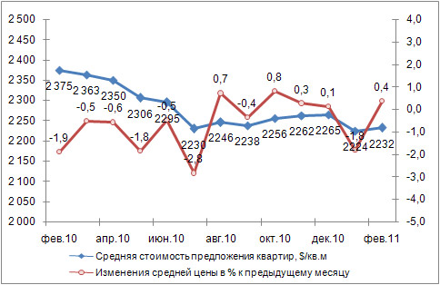 Таким образом, относительно февраля 2010 года, средняя цена 1 кв. м квартир уменьшилась на 6%. Индекс роста составил 0,94.