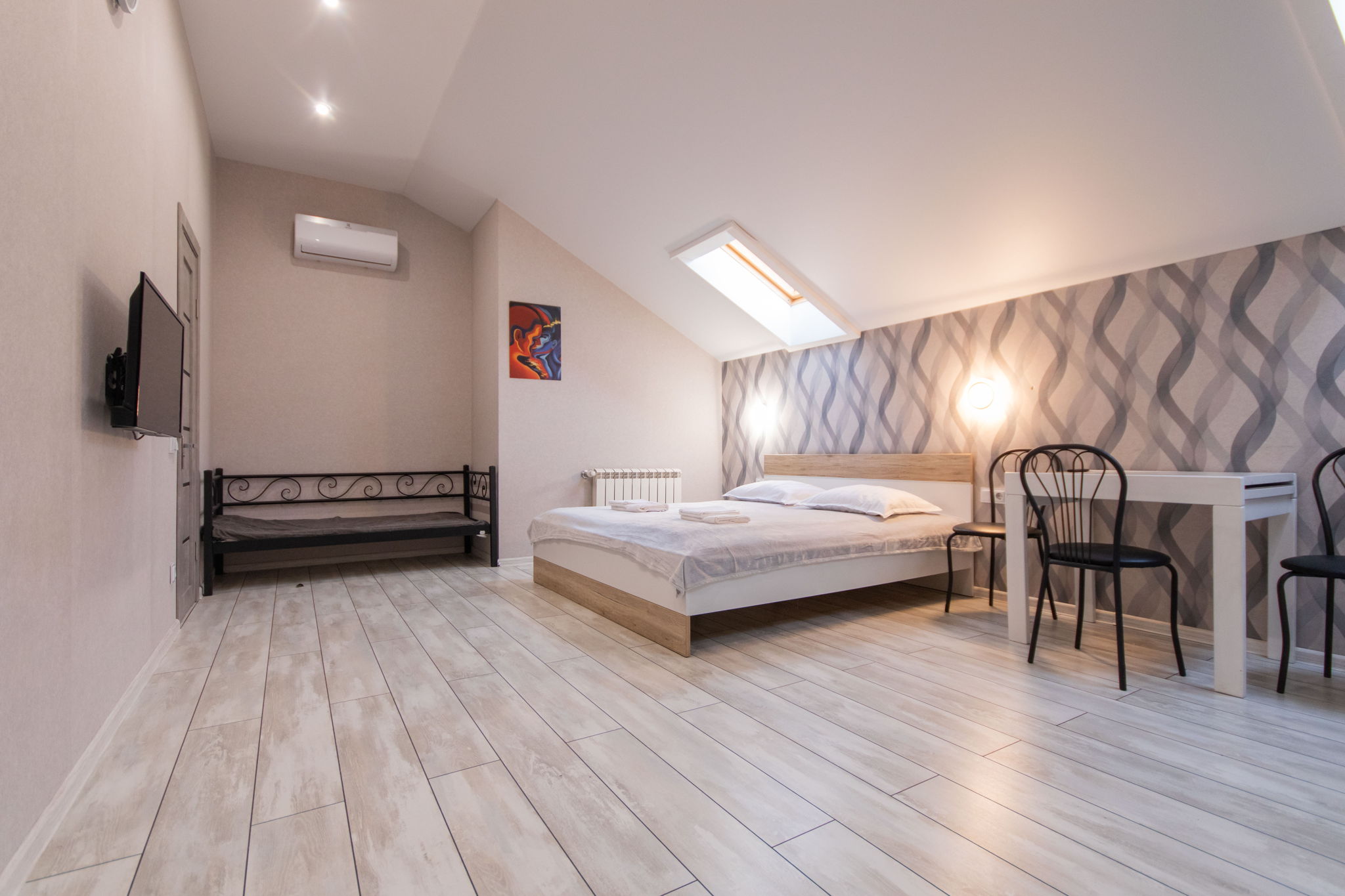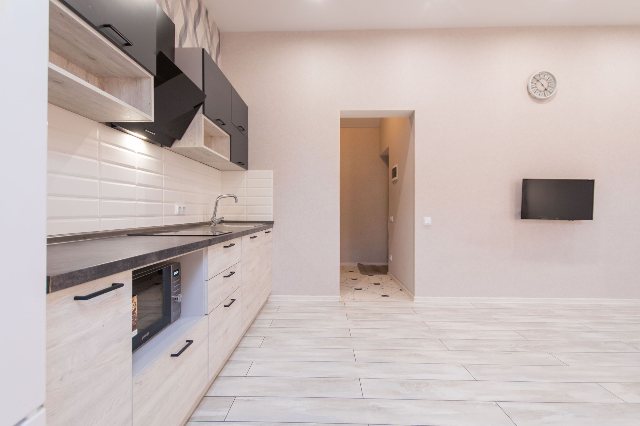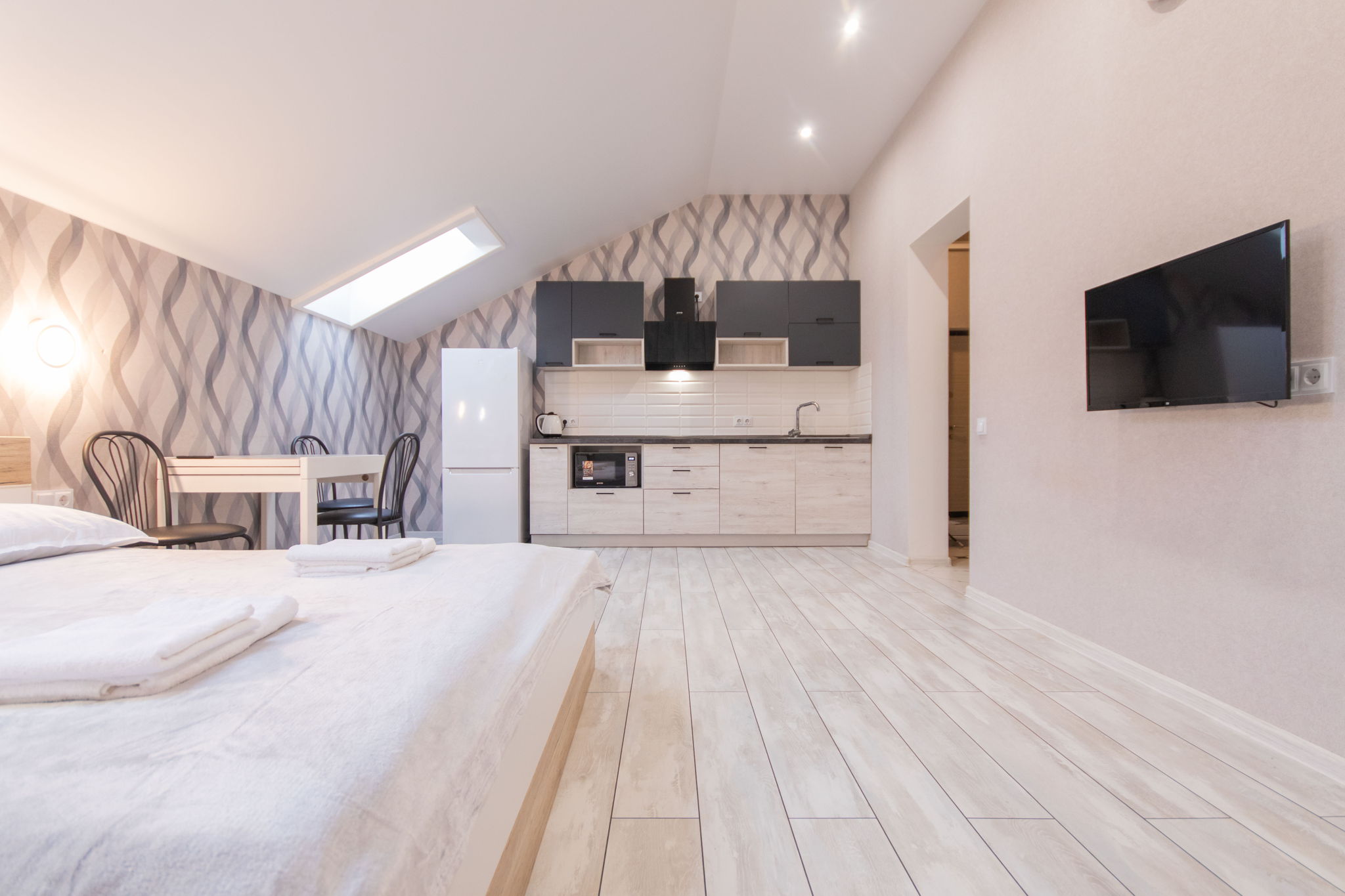 Апартаменти знаходяться поблизу м. Університет (в 6 хвилинах ходьби) та станція м. Вокзальна (в 11 хвилинах ходьби). Поблизу пішої доступності розташовані: ТЦ Універмаг Україна, ресторани, кафе, кав'ярні, відділення «Нова Пошта» та супермаркет Сільпо. Апартаменти з лаконічним та свіжим ремонтом, виконана у світлих тонах та комфортабельними меблями. У передпокої знаходиться шафа-купе для речей та маленька банкетка. Всередині розташована зона кухні, в якій знаходиться: меблевий гарнітур у світлому дереві, робоча поверхня з раковиною, холодильник, плита, витяжка, мікрохвильова піч і чайник. У зоні відпочинку розміщено: двоспальне ліжко з ортопедичним матрацом, два підвісні нічники і банкетка. Для комфортного проведення дозвілля надано кондиціонер, телевізор та WI-FI. Санвузол поєднаний з душовою кабіною, є раковина, а також пральна машина. В наявності завжди свіжа постільна білизна, чисті рушники та необхідні засоби гігієни.
