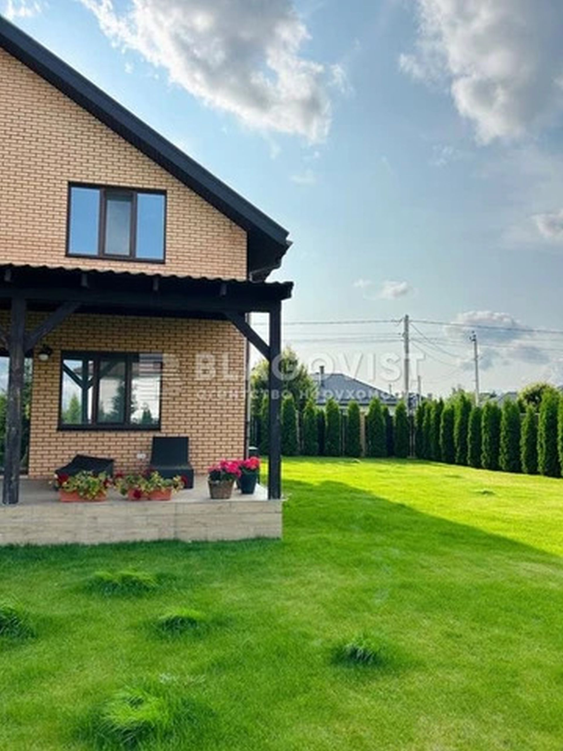 Пропонується сучасний будинок з якісним ремонтом, 20 хвилин до Києва, довкола озера, сучасні будинки. Будинок має два поверхи, два санвузли, три кімнати, кабінет та великий опенспейс із залом із кухнею, звідки йде вихід на терасу, яка повністю мебльована, зі світлом та розетками. Другий поверх - три спальні, комора, санвузол та балкон. До будинку прибудований гараж зі світлом, розетками та бензиновим генератором. Ділянка 7.5 соток, з доглянутим газоном, хвойними деревами та автоматичним поливом.