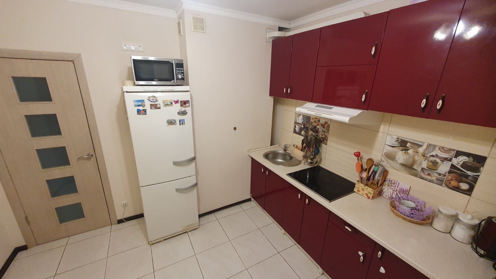 Кухня достатньо велика, 9,4 кв.м, також є уся необхідна техніка: мікрохвильова піч, духовА шафа, холодильник, чайник, індуктивна електроплита. Чималенький засклений балкон із панорамним видом на оксамитовий ліс на горі та стадіон. Є розпашна шафа.