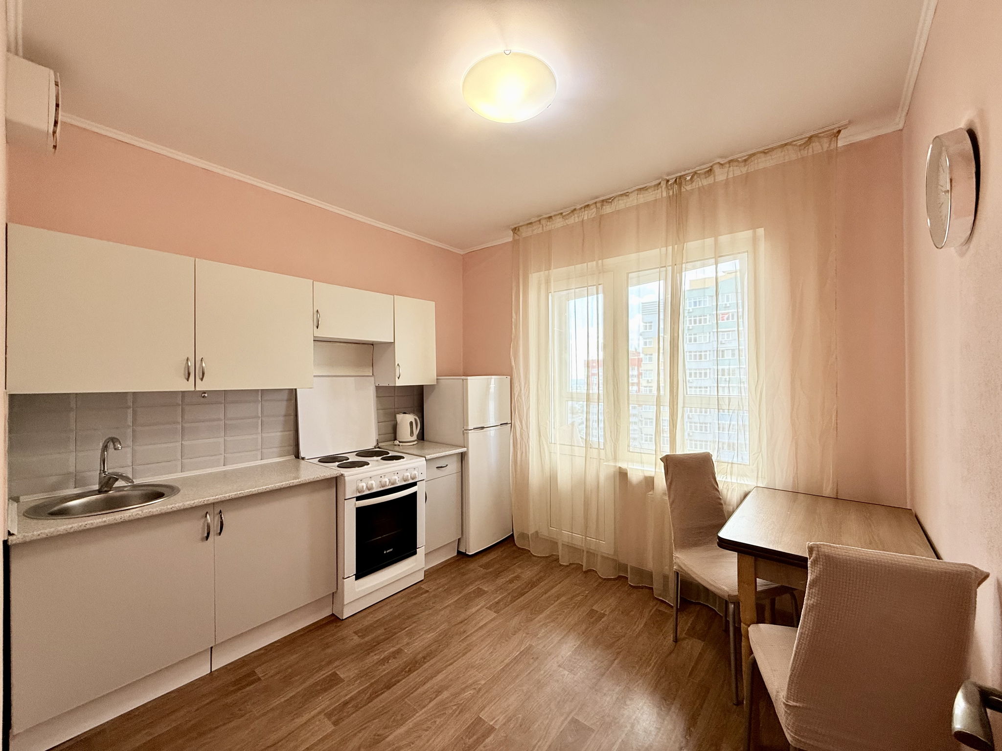 Встроенная кухня, мебель, двухспальная кровать, электроплита+духовка, электрочайник, холодильник, стиральная машина, бойлер, кондиционер, шкаф-купе, письменный стол, вся бытовая техника ведущих производителей, качественная сантехника, TV кабельное+интернет.