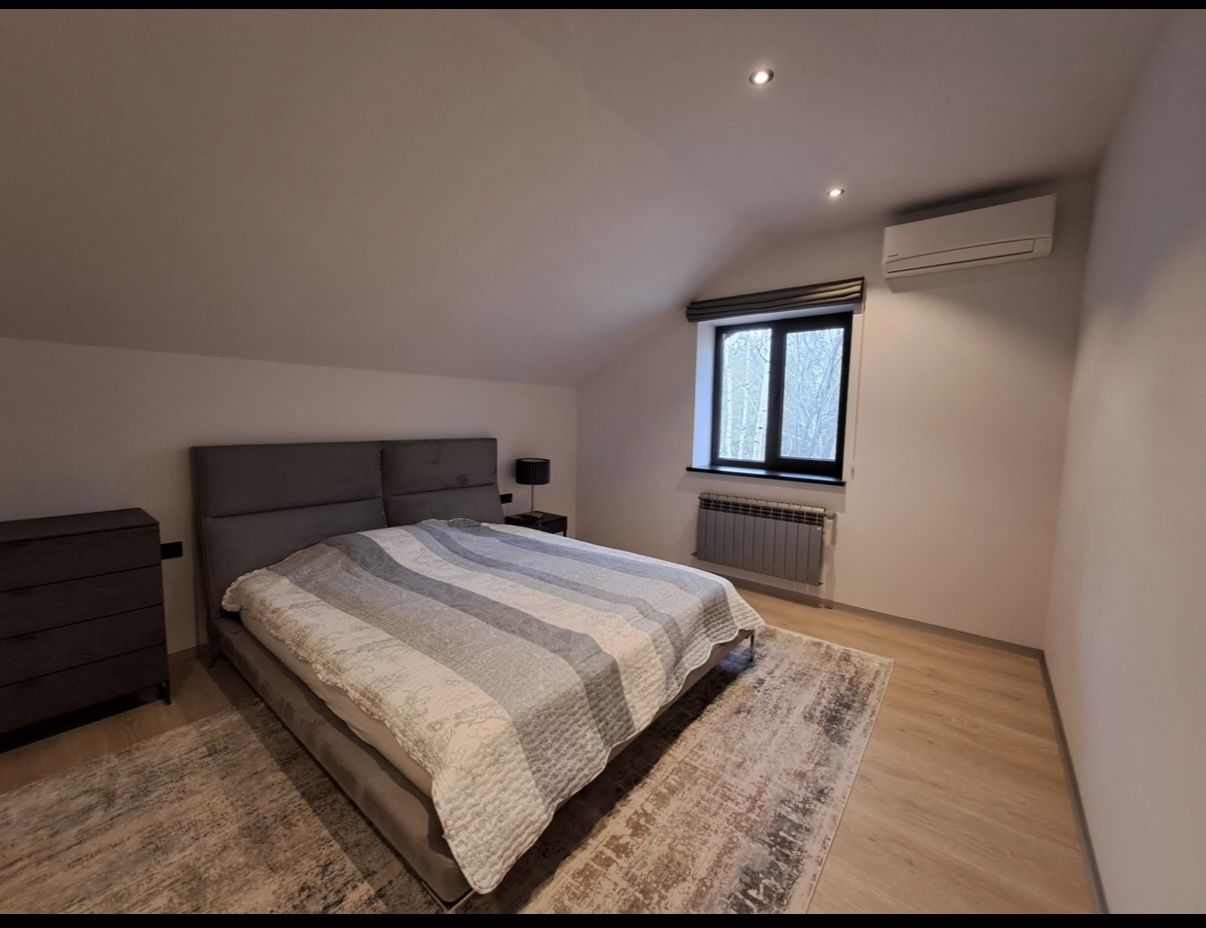 1 поверх – 2 кімнати, кухня з просторою гостинною, котельня з газовим і твердопаливним котлами, сан/вузол з великою ванною. 2 поверх – спальня, велика гардеробна, сан/вузол з душ.кабіною. Будинок мебльований: три 2-х спальні ліжка, шафи-купе. Вся битова техніка. Тераса з столом і стільцями. Гостьовий будинок із зоною барбекю і господарське приміщення. Накриття на два автомобілі. Вода зі свердловини, опалення – газ. Встановлена сонячна батарея, є генератор. Зручне розташування будинку, до Києва 10 км. Чудова можливість жити у затишному, теплому та комфортному будинку.