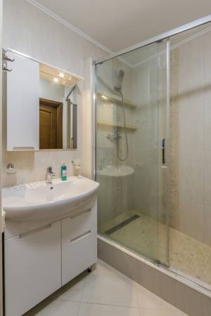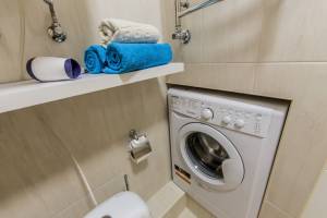 Санвузол суміщений із душовою кабіною, у ньому є умивальник із дзеркалом, тумбочка та пральна машина.