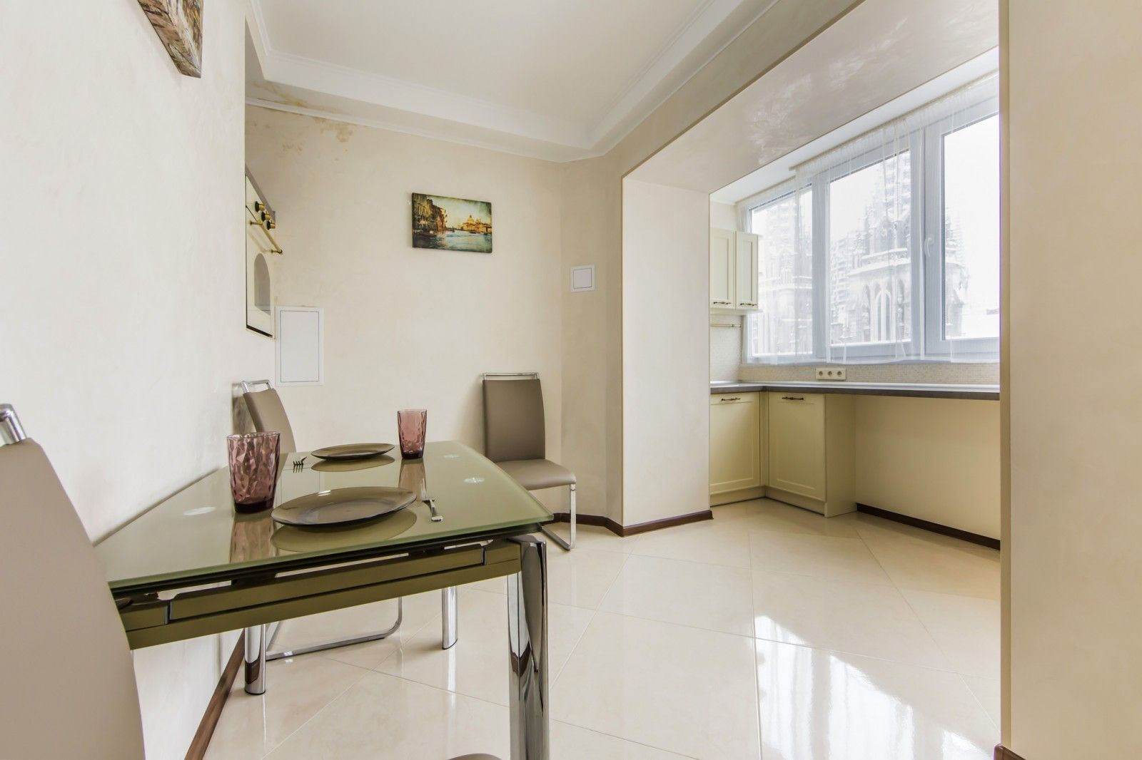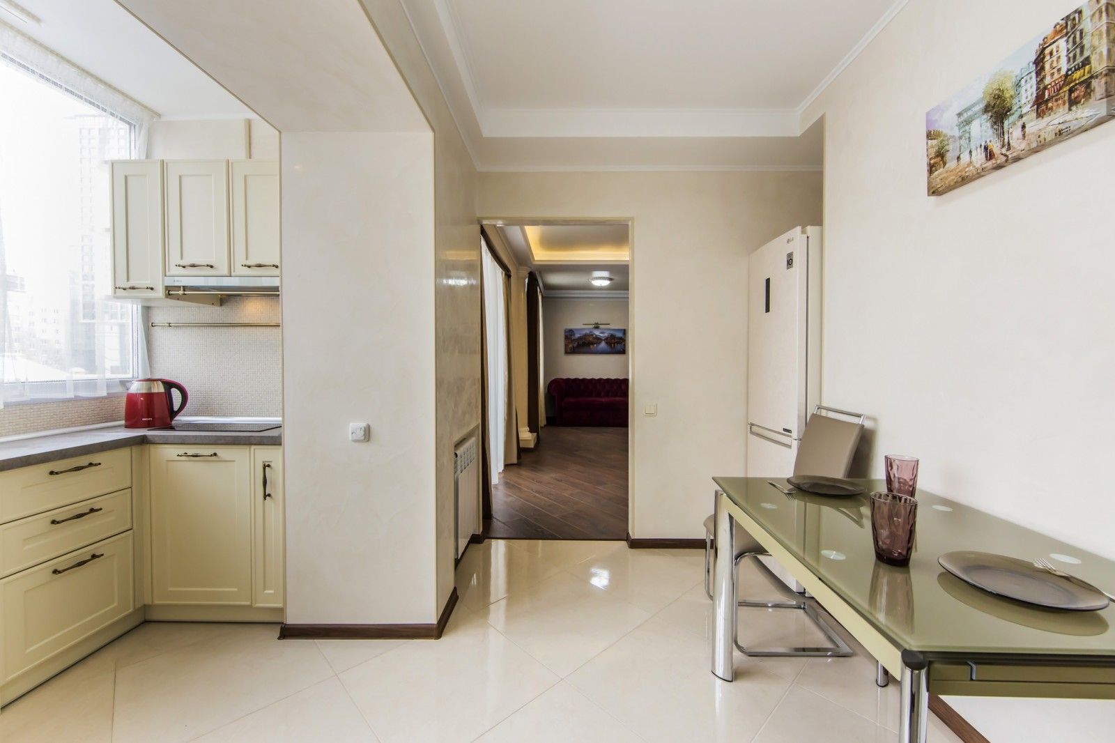 Квартира з сучасним ремонтом, виконана у світлих тонах із яскравими акцентами.