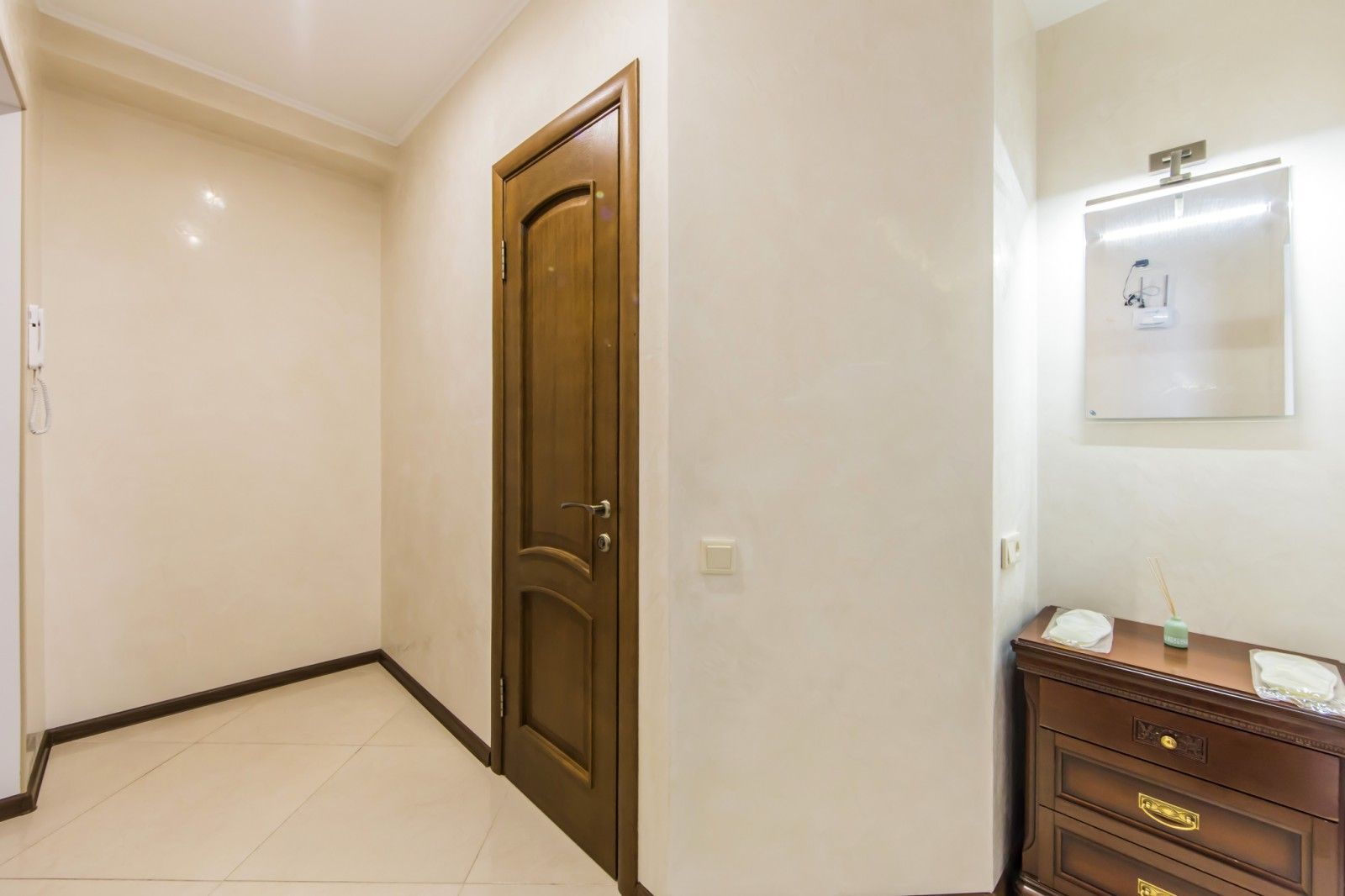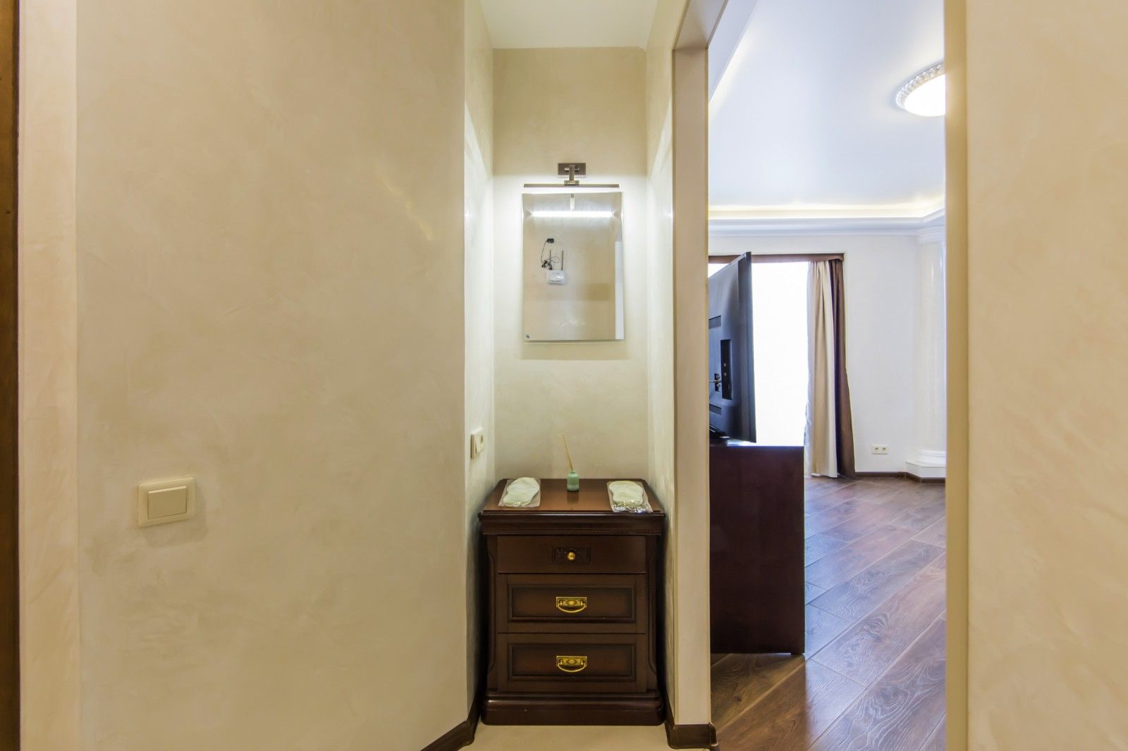 При вході розташований комод із дзеркалом.