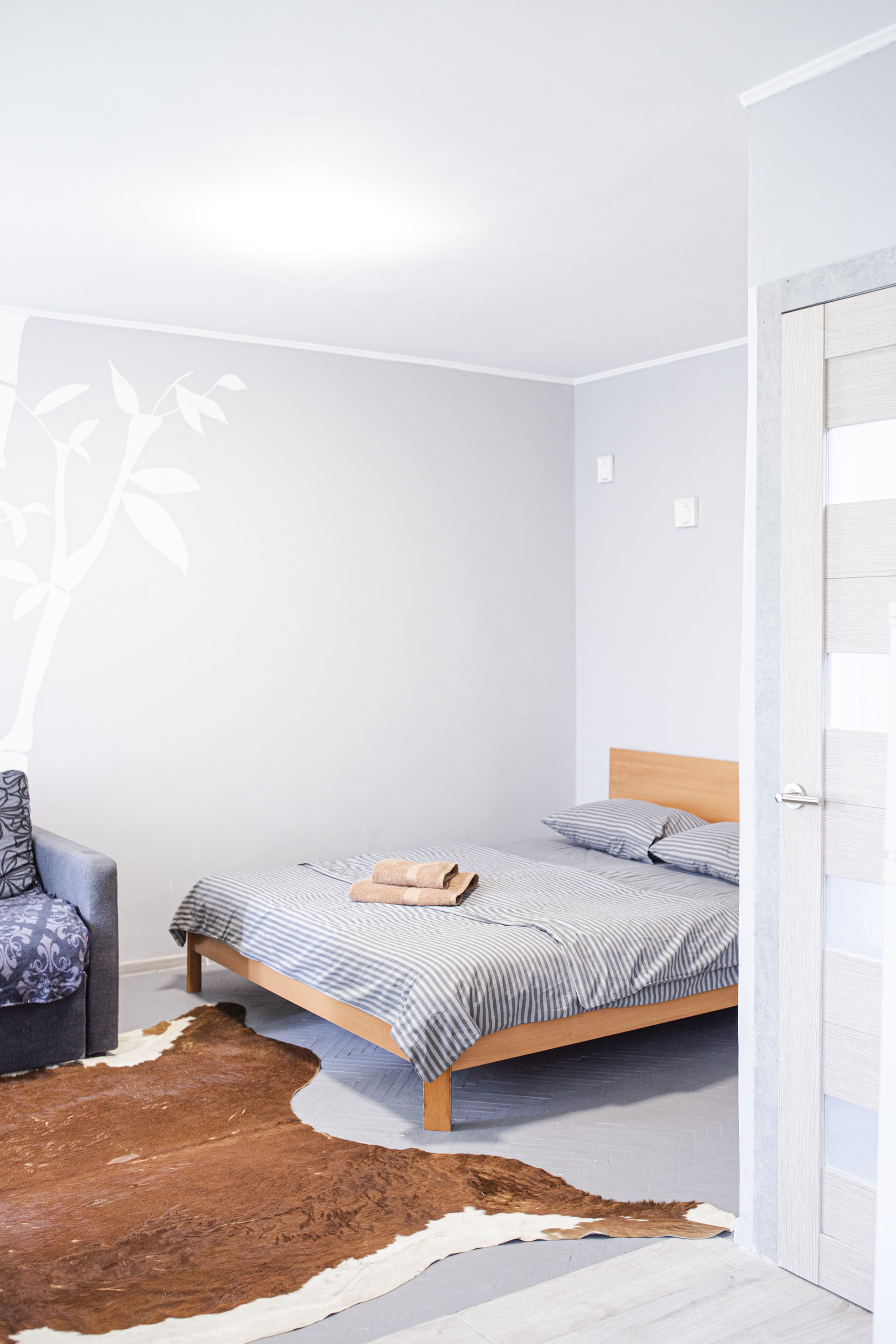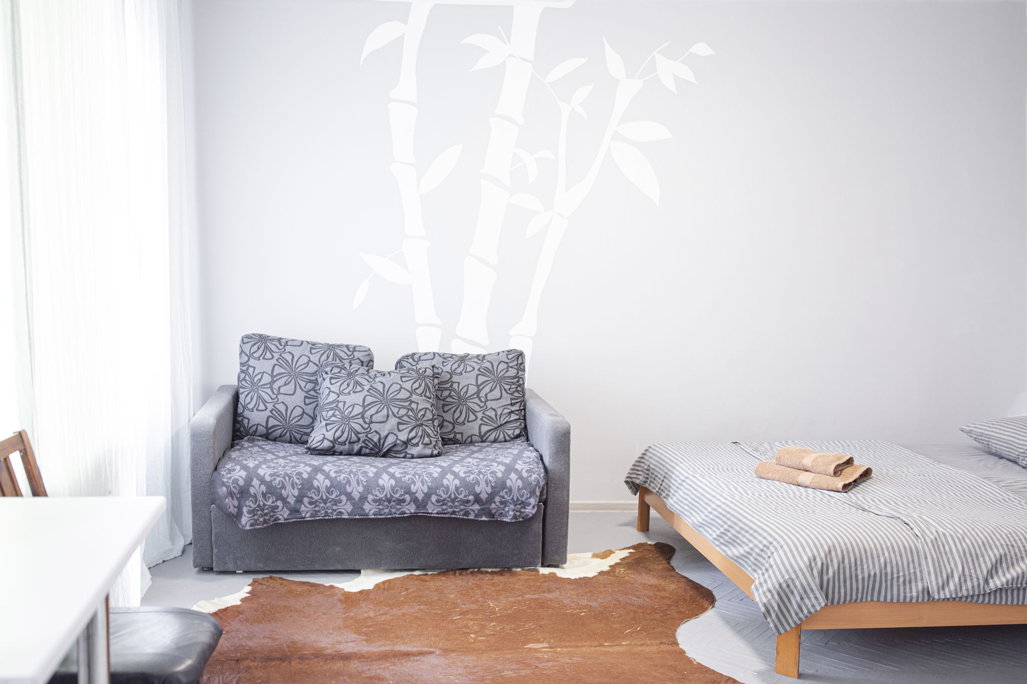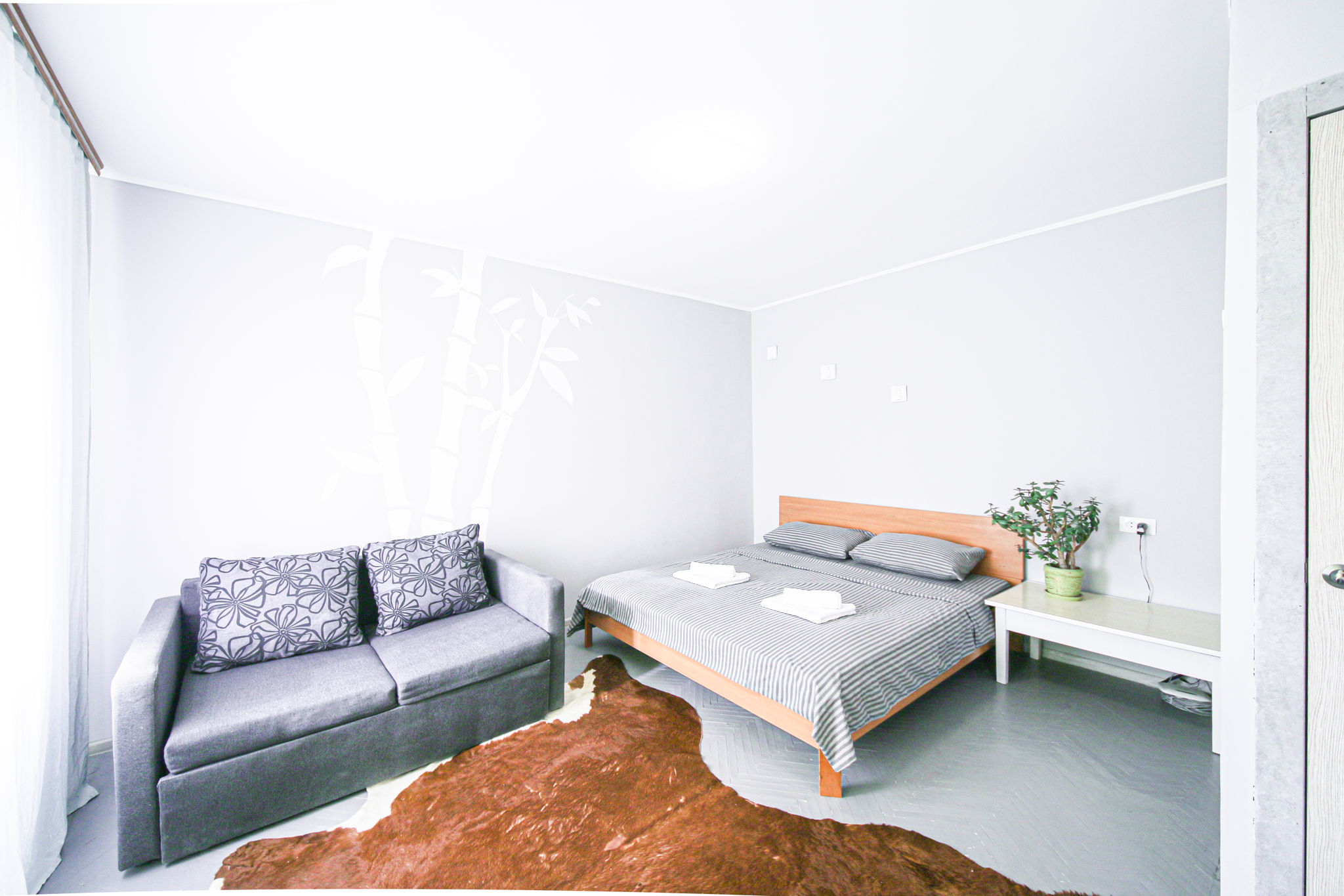 Кімната оформлена в пастельному відтінку сірого кольору з акцентною стіною, на якій зображені білі стебла бамбука. У зоні спальні розташоване двоспальне ліжко з ортопедичним матрацом і невеликий столик. У зоні відпочинку — акуратний диван (розкладний), кілька м’яких стільців, обідній стіл зі стільцями, а для приємного дозвілля встановлено телевізор.