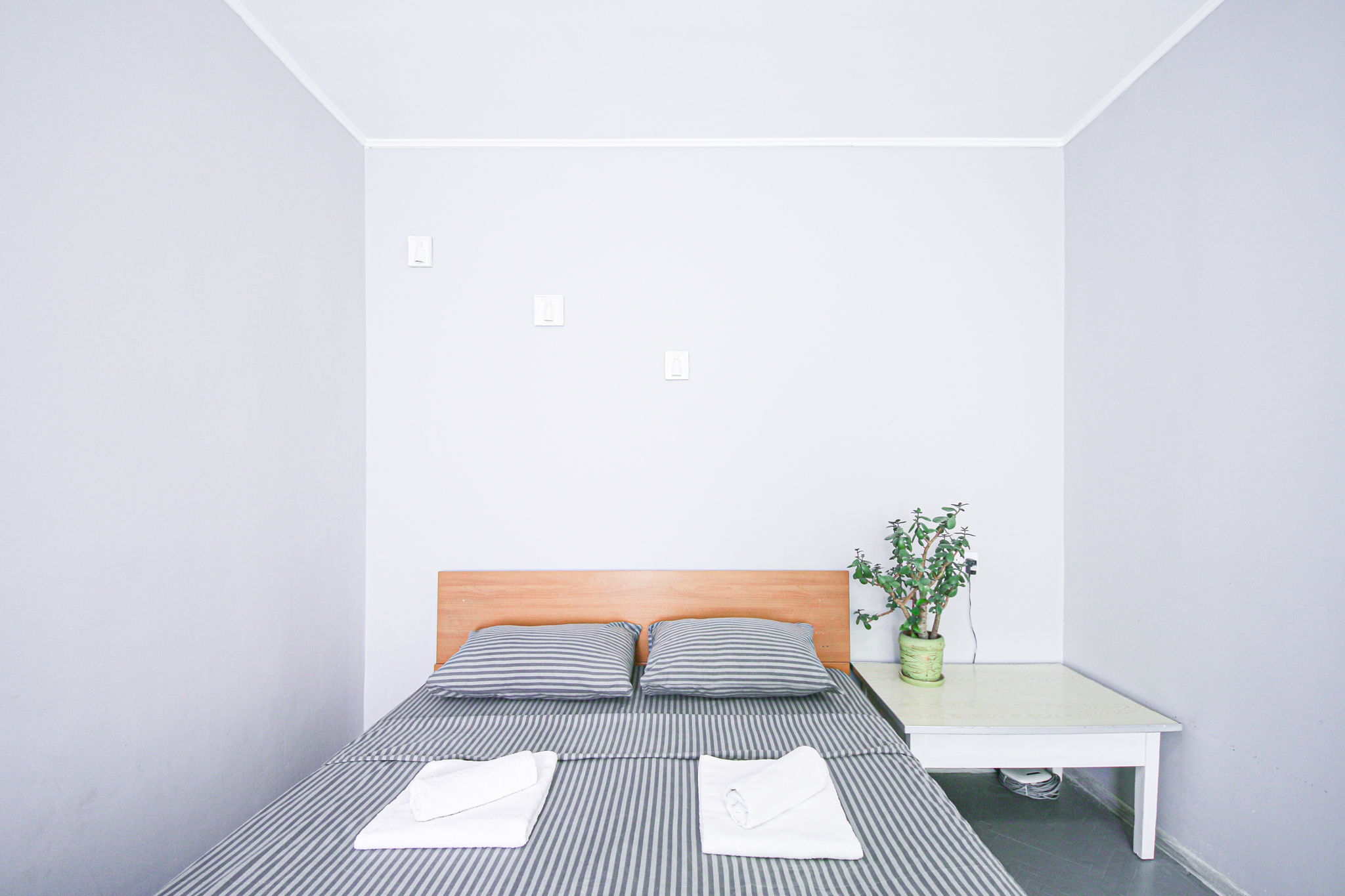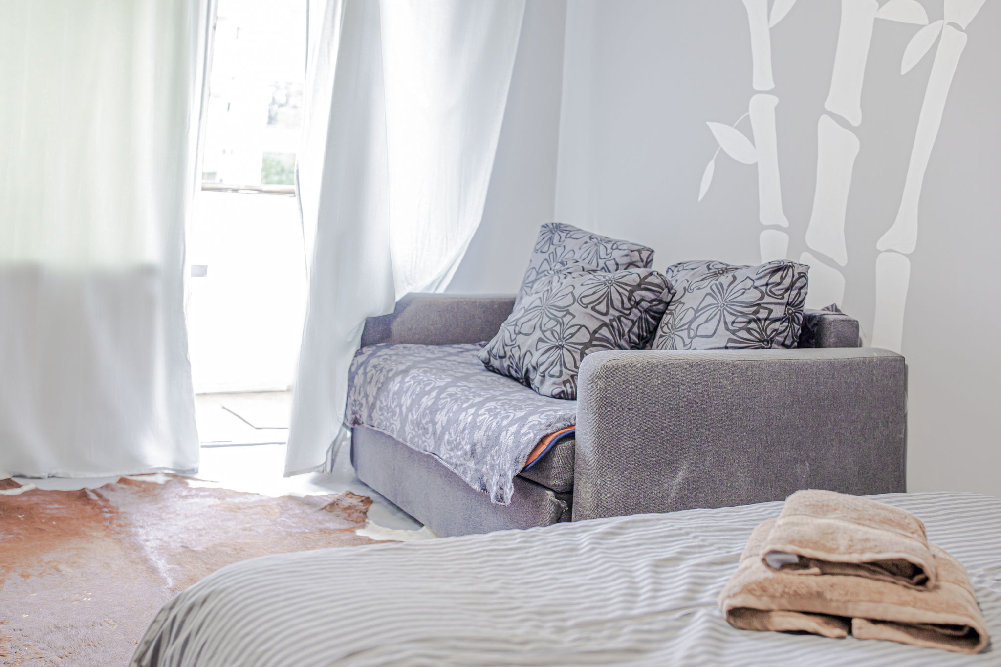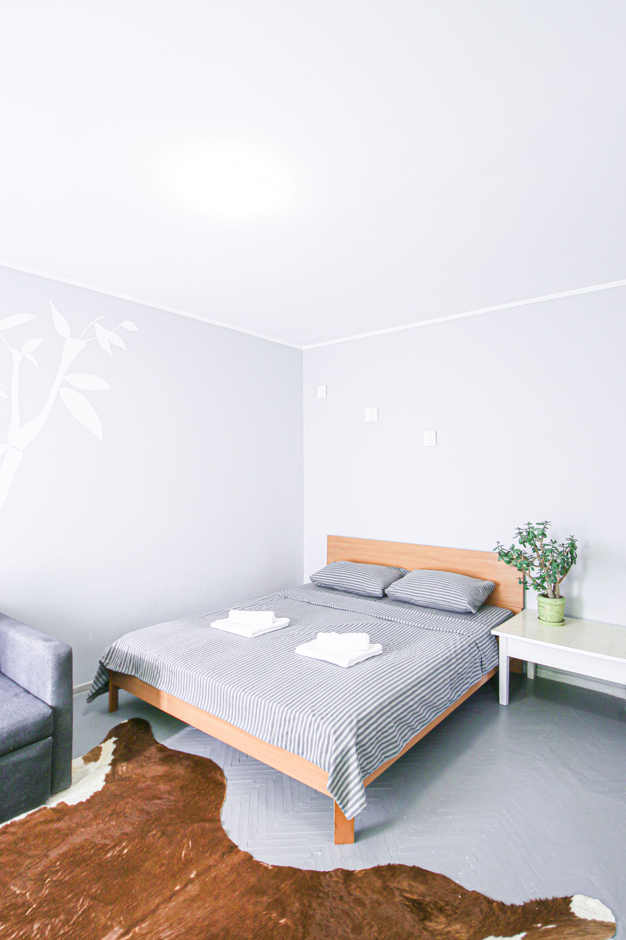 Кімната оформлена в пастельному відтінку сірого кольору з акцентною стіною, на якій зображені білі стебла бамбука. У зоні спальні розташоване двоспальне ліжко з ортопедичним матрацом і невеликий столик. У зоні відпочинку — акуратний диван (розкладний), кілька м’яких стільців, обідній стіл зі стільцями, а для приємного дозвілля встановлено телевізор.