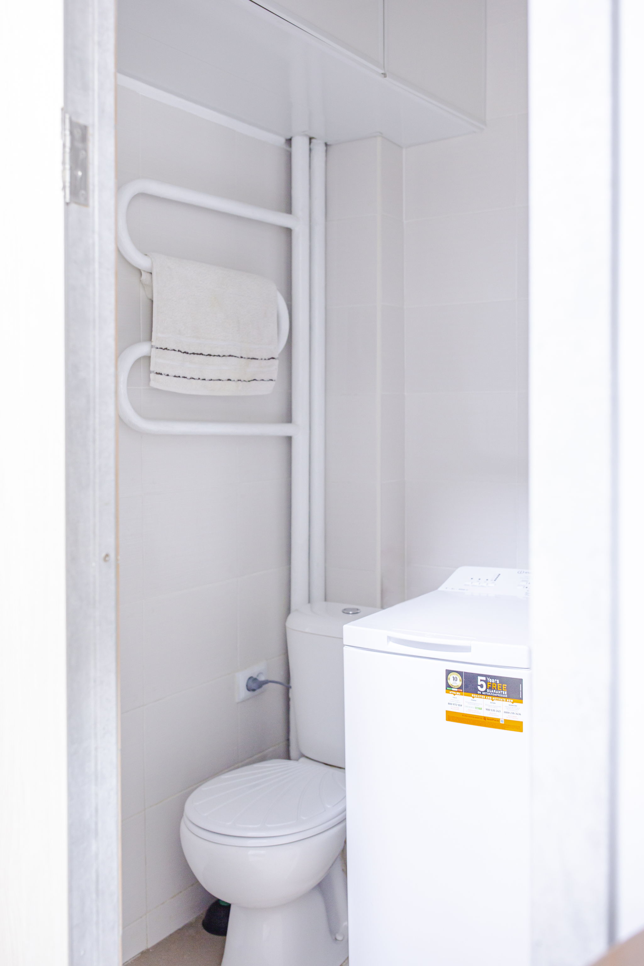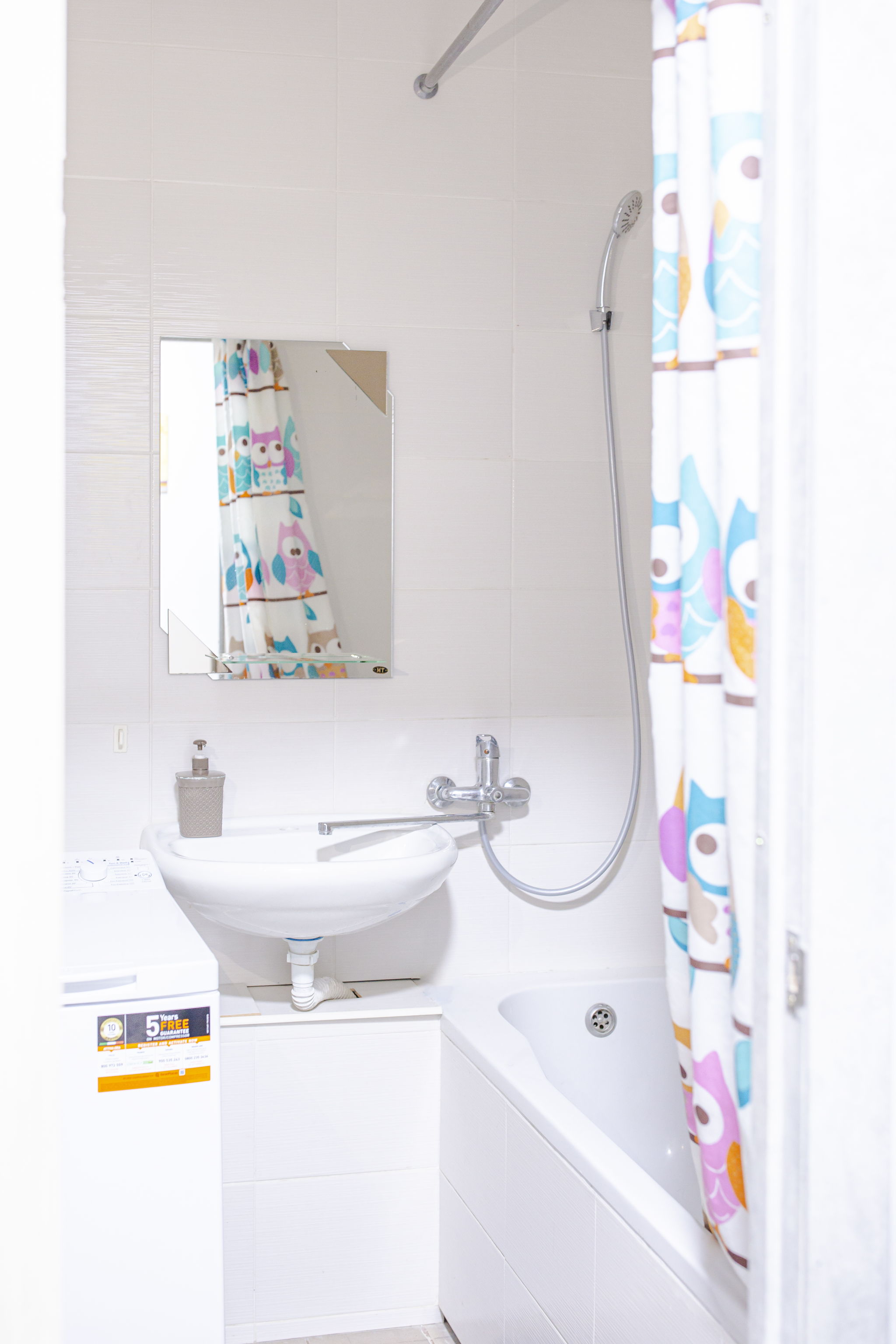 Ванна кімната оформлена у білому та кремовому кольорах плитки. Усередині розташовані: ванна, туалет, умивальник із дзеркалом, рушникосушарка та пральна машина.