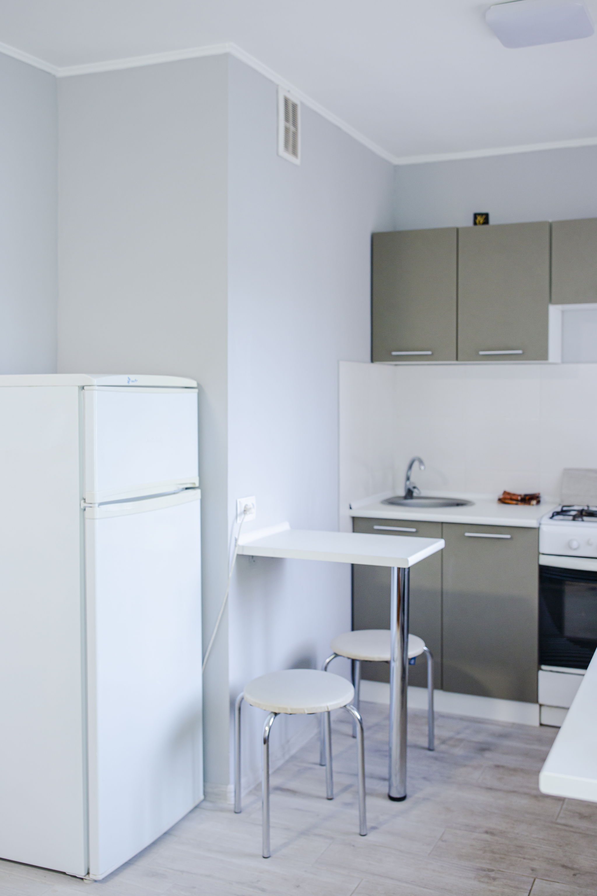 Кухонний гарнітур виконаний у бежевому кольорі, стільниця — біла. Є вся необхідна побутова техніка: холодильник, плита, духовка та чайник.