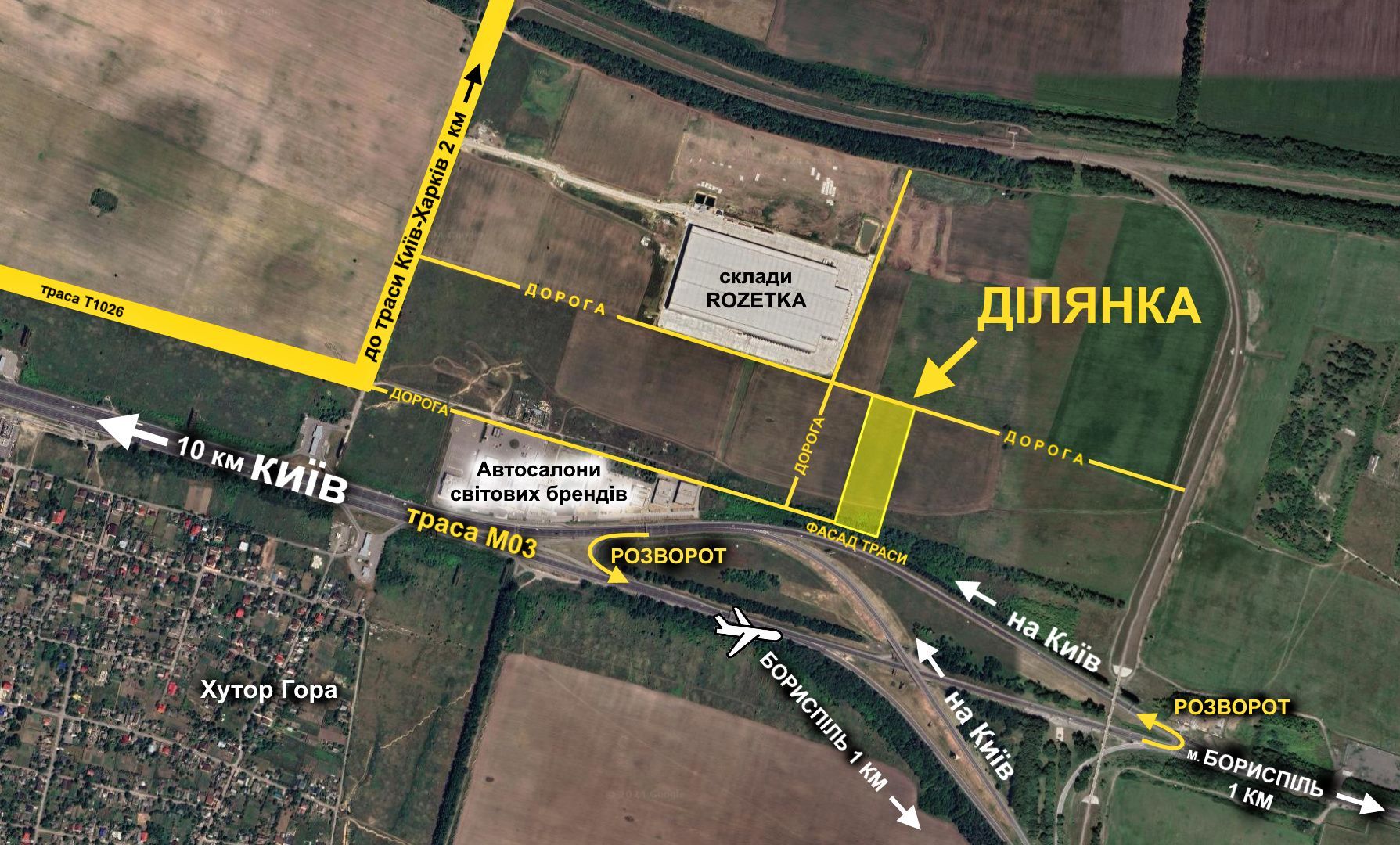 Продается фасадный земельный участок коммерческого назначения на автомобильной развязке: Киев – международный аэропорт "Борисполь" – город Борисполь. Общая площадь 2,25 га (возможно увеличение площади до 4,5 га). Целевое назначение участка соответствует актуальному плану застройки территории, разрешающему строительство любого коммерческого объекта. Участок ровный, имеет форму правильного прямоугольника. Фасадная часть – 87 метров, длина – 260 метров. Двухсторонний подъезд. Какие-либо ограничения (частичные ограничения) на использование участка: охранные, санитарные зоны и прочее - отсутствуют. Частная собственность физического лица. Любая форма расчета. Продажа без комиссионных, по цене собственника.